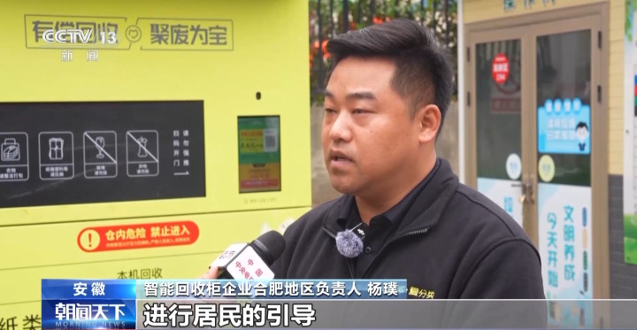 智能回收柜企业合肥地区负责人杨璞:在设备进入小区的初期,我们会有专业的垃圾分类引导员,进行居民的引导和机器设备的使用方法介绍。说明哪些属于非投递物。如果有违规投递的话,我们会通过内部的摄像头监控拍照,然后给居民进行短信提示。
