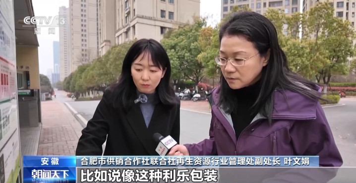 合肥市供销合作社联合社再生资源行业管理处副处长叶文娟:回收物基本上囊括了我们所谓的低值可回收物,比如像这种利乐包装、牛奶盒,还有像气泡膜,这种可能在一般的废品回收站不收,我们都要求企业兜底回收了。